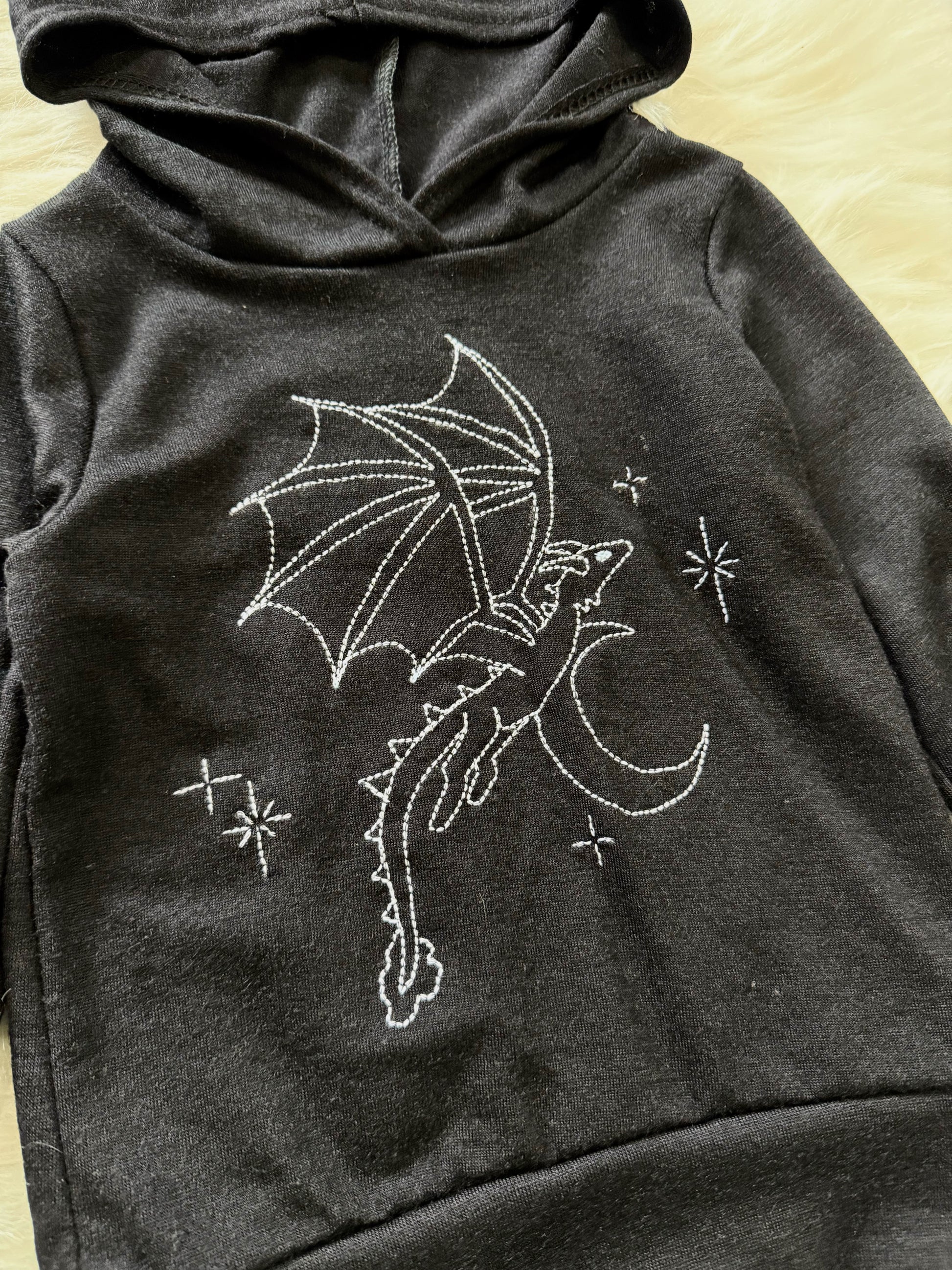 This awesome little hooded shirt is made from 100% merino wool jersey, non-superwash. 200gsm. Featuring a super cool freehand machine embroidered flying dragon design on the front. Grow-with-me sizing fits appx 12m-3T. Hood is single layer to keep you cool and protected from the sun, or just add that extra bit of warmth on a chilly day.